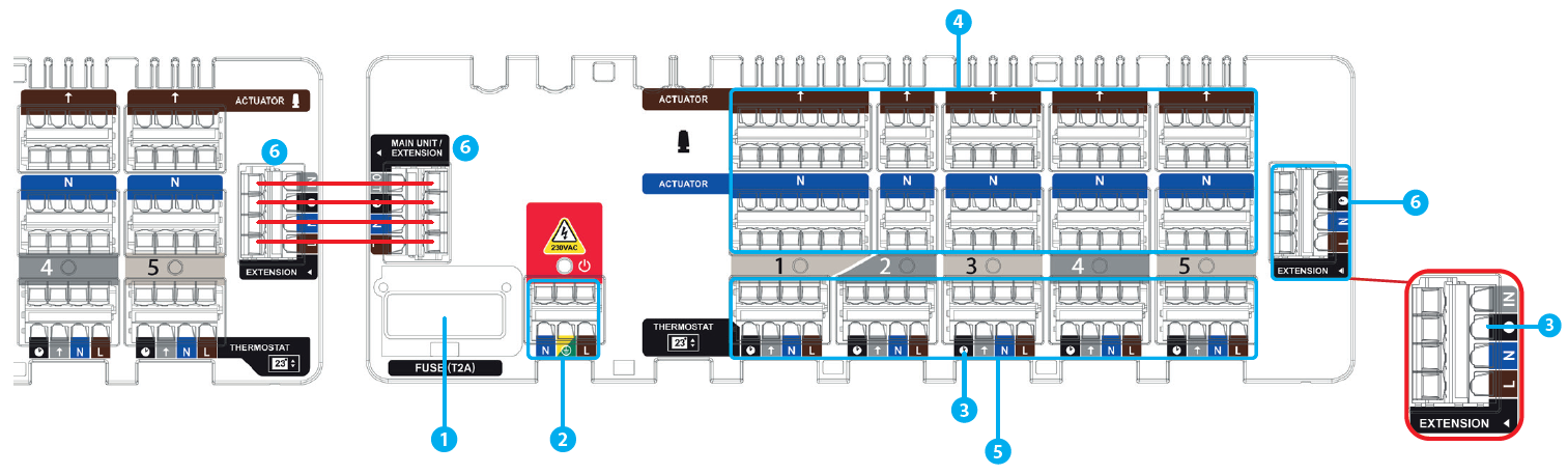 * UWAGA! Jeśli listwy sterujące CB500 i CB500X połączone są za pomocą złącza EXTENSION, to nie wolno podłączać dodatkowego zasilania 230V do styków zasilających w listwie