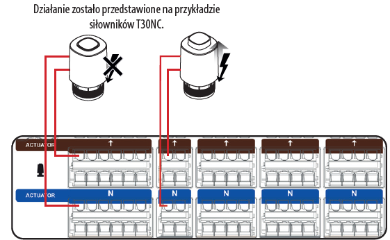 Przewody siłowników termoelektrycznych należy wpinać w złącza sprężynowe w odpowiednich strefach.