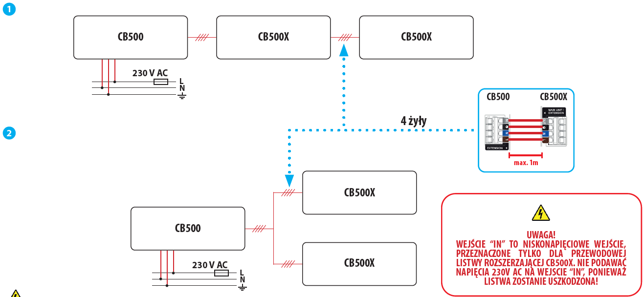 1. Zasilanie 230V AC doprowadzone jest tylko do listwy głównej CB500. Do wejścia EXTENTION w listwie głównej CB500 można dołączyć max 2 listwy podrzędne CB500X za pomocą 4-żyłowego przewodu