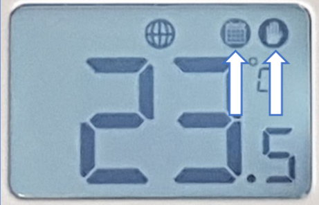 Aby Aktywować: Użyj strzałek w górę i w dół aby wybrać żądaną temperaturę. Wybrana temperatura mignie dwa razy, zanim powróci do ekranu bieżącej temperatury. Tryb tymczasowego nadpisania zostanie potwierdzony przez ikonę „ręki” oraz ikonę harmonogramu wyświetlaną w prawym górnym rogu ekranu.